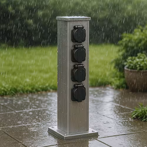 An outdoor socket outlet with protective flaps, seals and a robust housing (at least IP 44, better IP 65) can withstand rain, snow and splashing water. Your power supply remains protected - at all times
