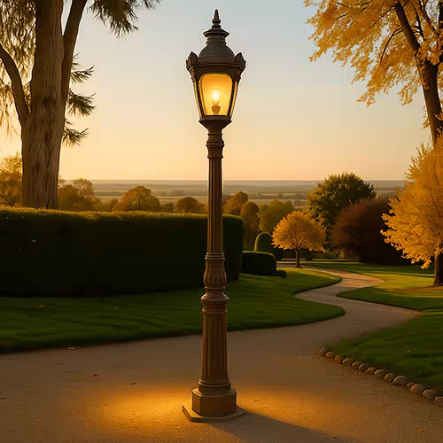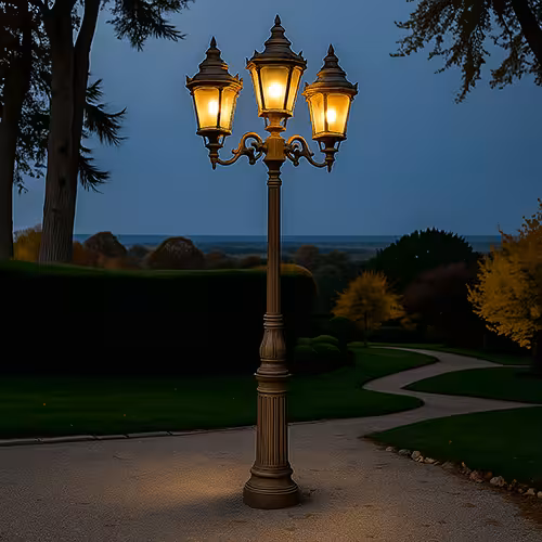 This variant is reminiscent of classic gas lanterns. They are usually made of cast aluminium or iron, often with a patina look and decorative ornaments. Several lamp heads on a pole create a particularly festive effect. Ideal for: Parks, villa gardens, historic urban areas.