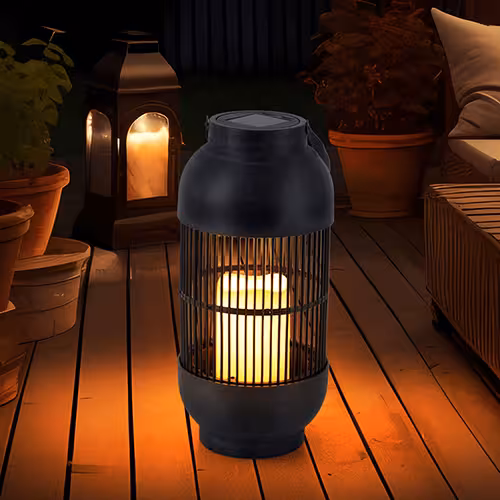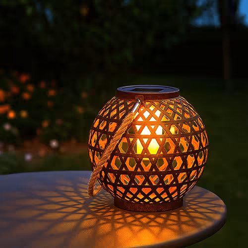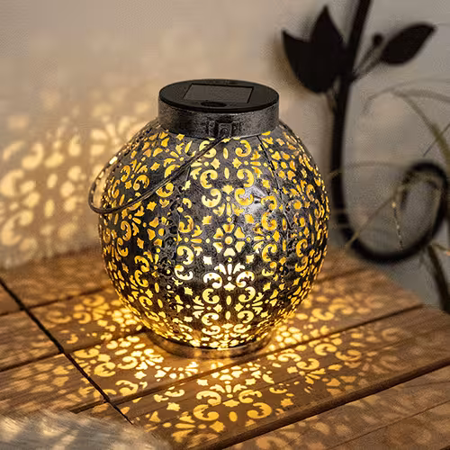 Solar lanterns are available in many materials: stainless steel, plastic, bamboo or glass. Depending on the material and shape, a different play of light is created. Metal models with openwork patterns cast fascinating shadows.
